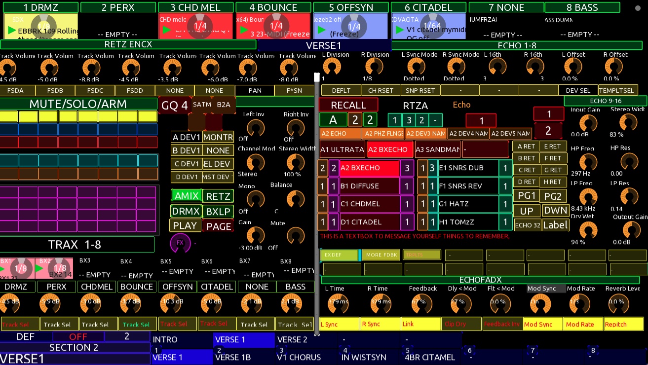 Between Ableton Live & a menagerie of controllers there is a custom- built scripted interface allowing hands-on realtime performance control of mixing , looping & dub style fx